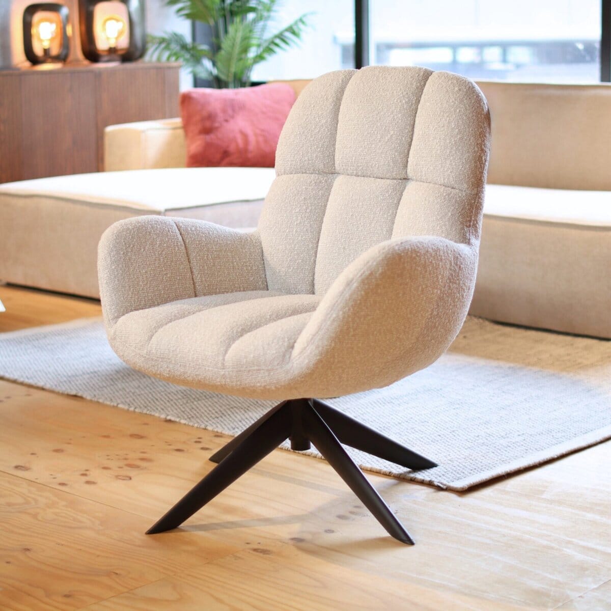 De Elvis draaifauteuil combineert comfort en stijl in één prachtig ontwerp. Met zijn zachte boucléstof en moderne draaifunctie is deze fauteuil perfect voor ontspanning in de woonkamer, slaapkamer of studeerkamer. Verkrijgbaar in gebroken wit voor een frisse, lichte uitstraling, of in antraciet voor een stoere, moderne touch. Een ideale keuze voor wie comfort en design wil combineren.